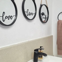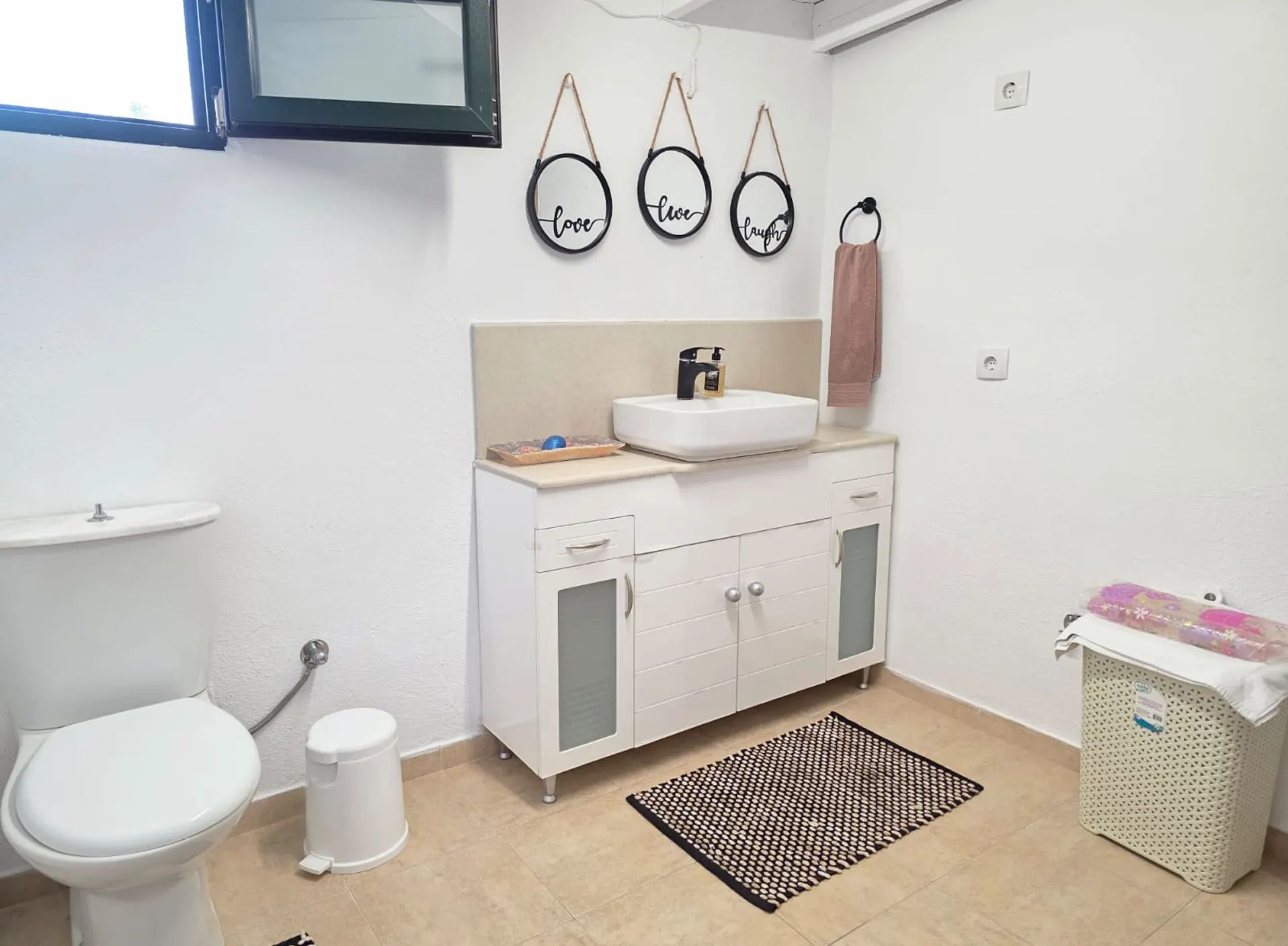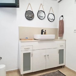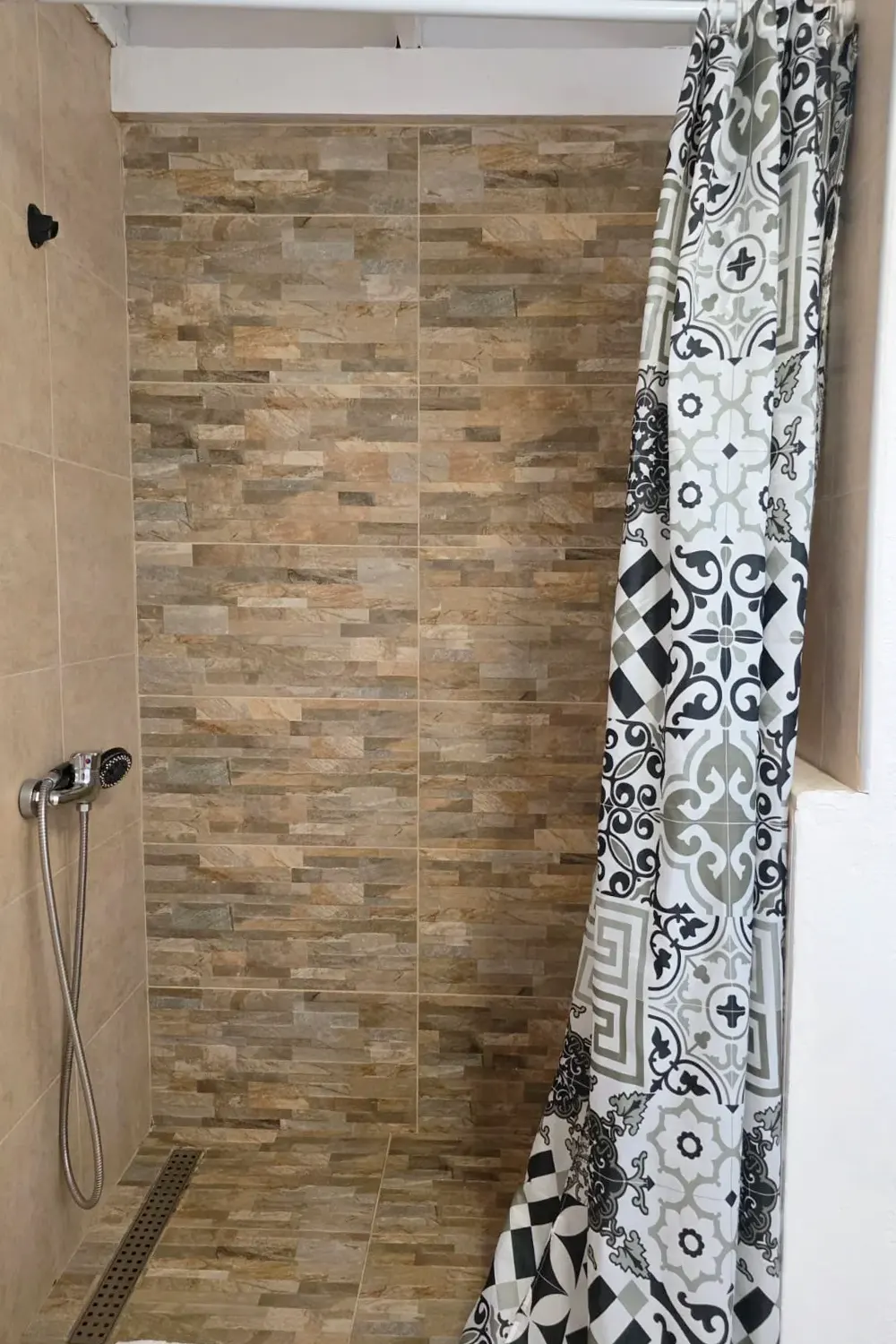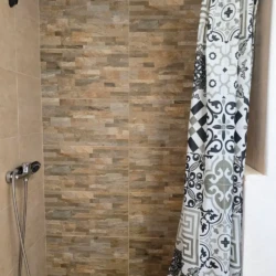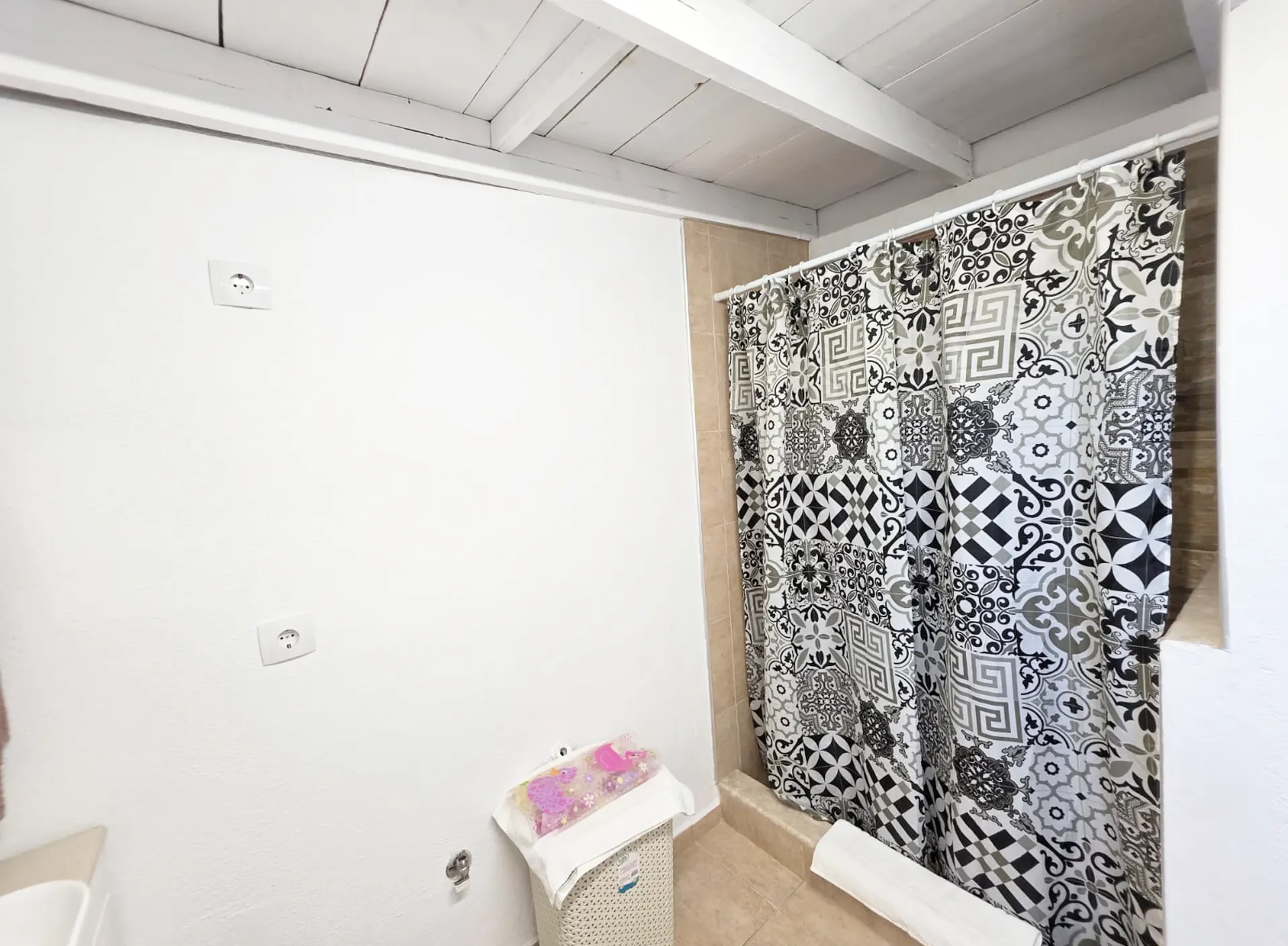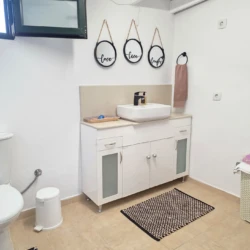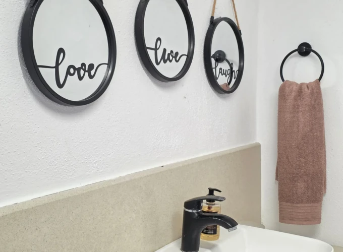 • Bathroom: Modern and clean, with shower