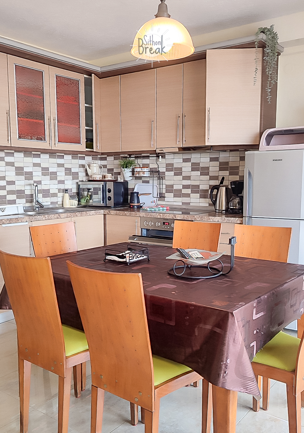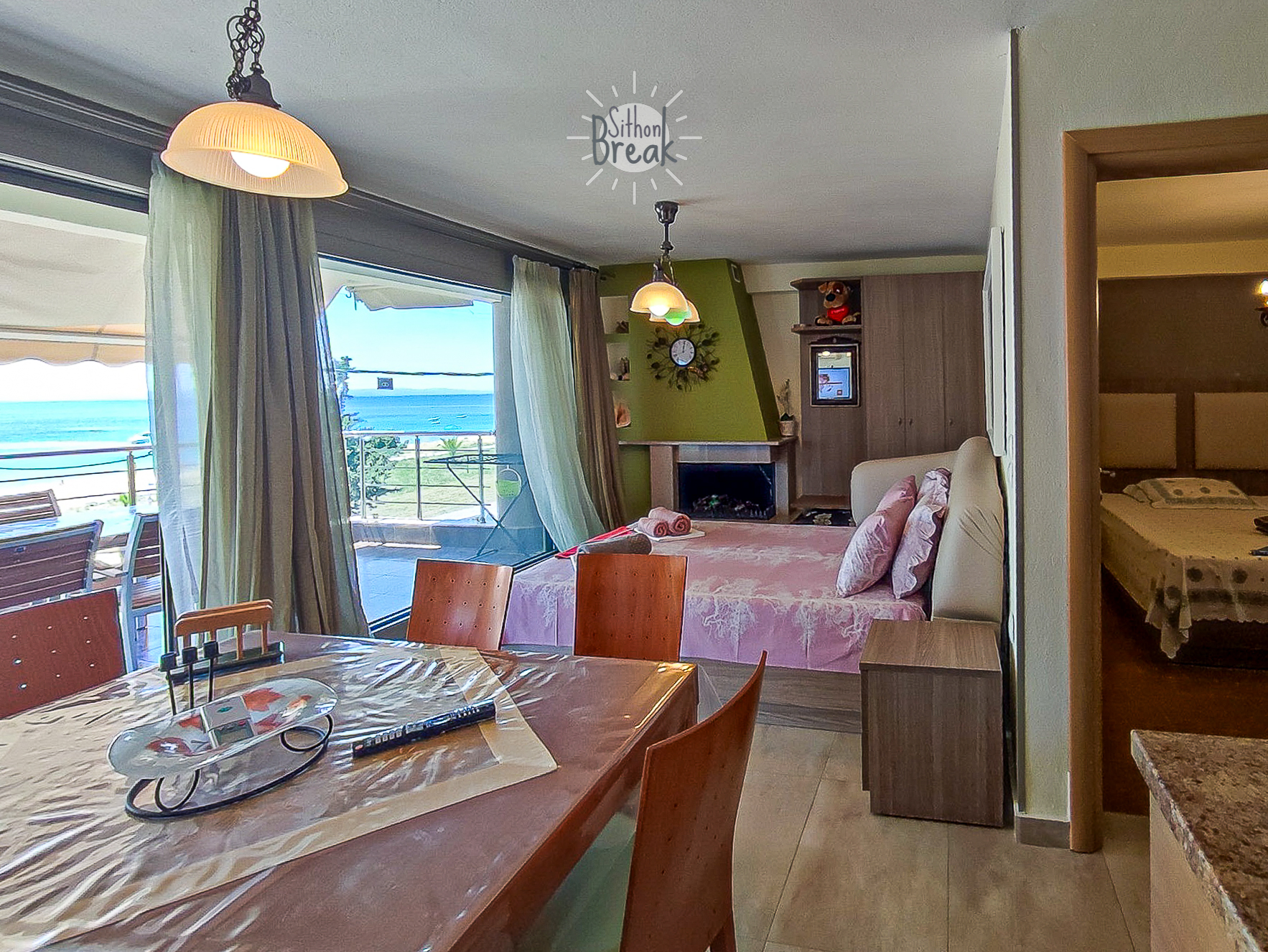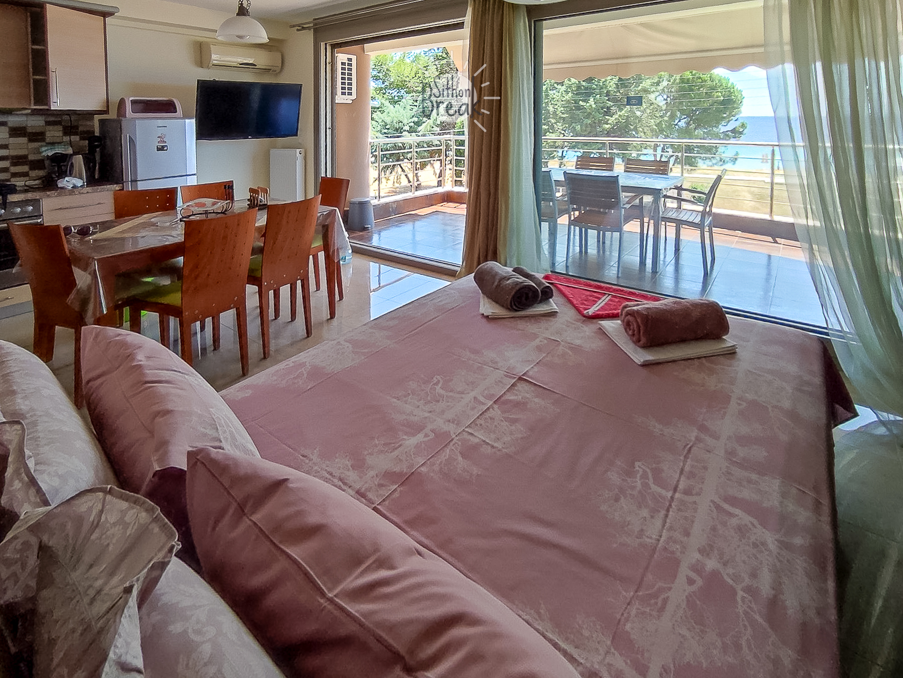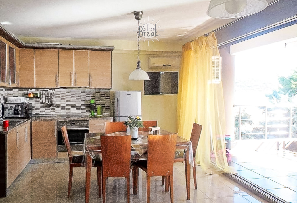 In a serene coastal setting, in one of the most beautiful areas of Sithonia, Halkidiki. It is a centrally located apartment, within walking distance of a supermarket, tavernas, and beach bars.