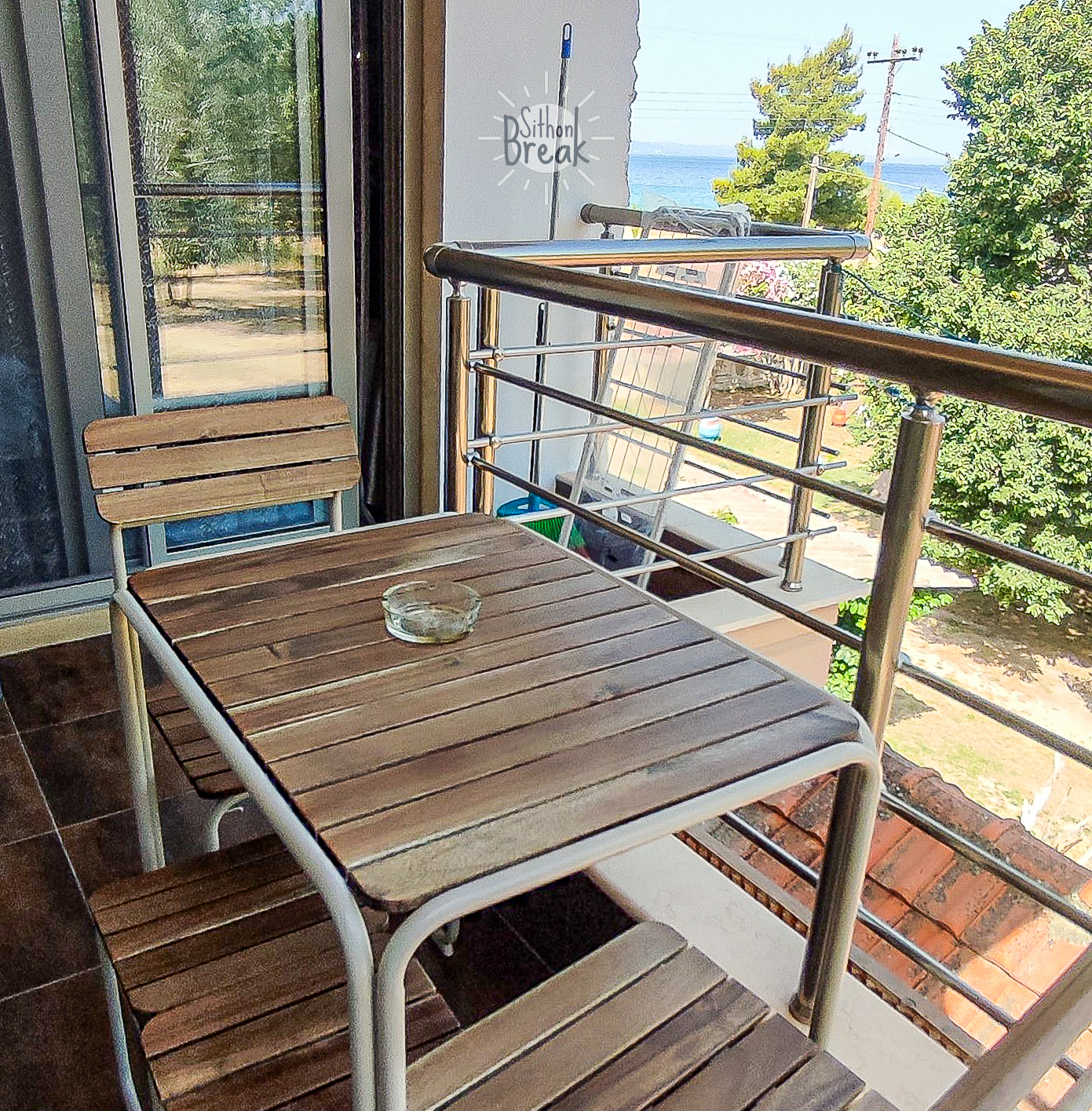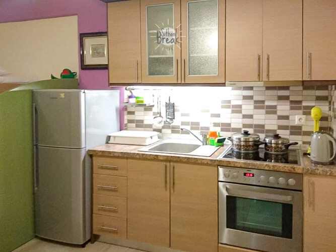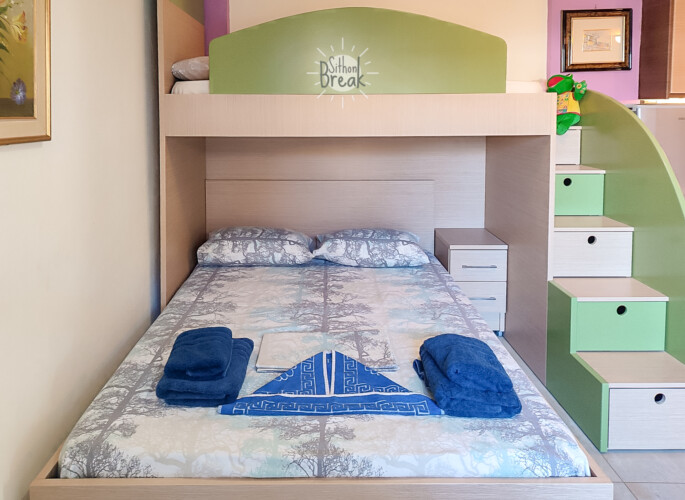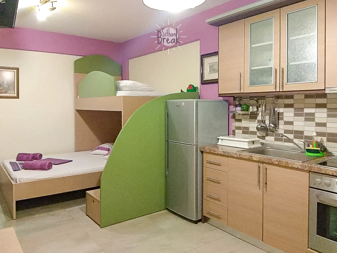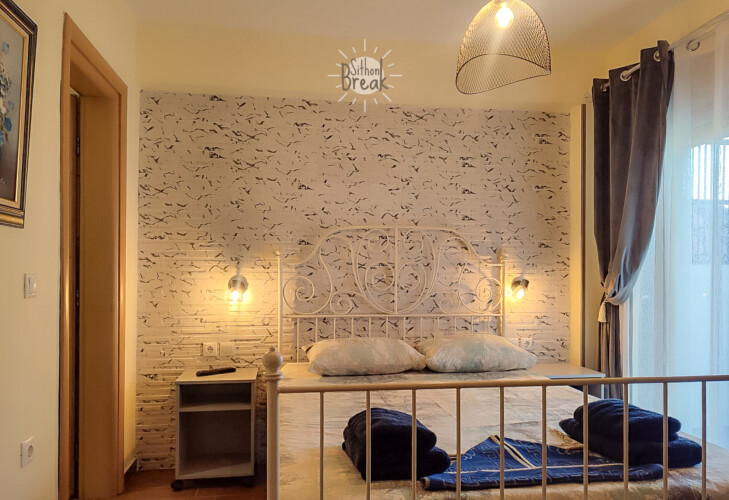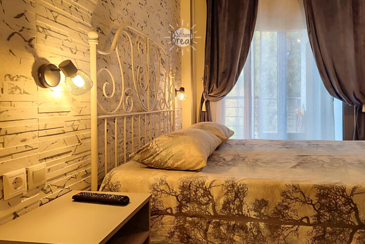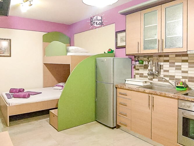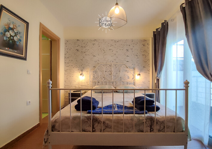 In a serene coastal setting, in one of the most beautiful areas of Sithonia, Halkidiki.  It is a centrally located apartment, within walking distance of a supermarket, tavernas, and beach bars.