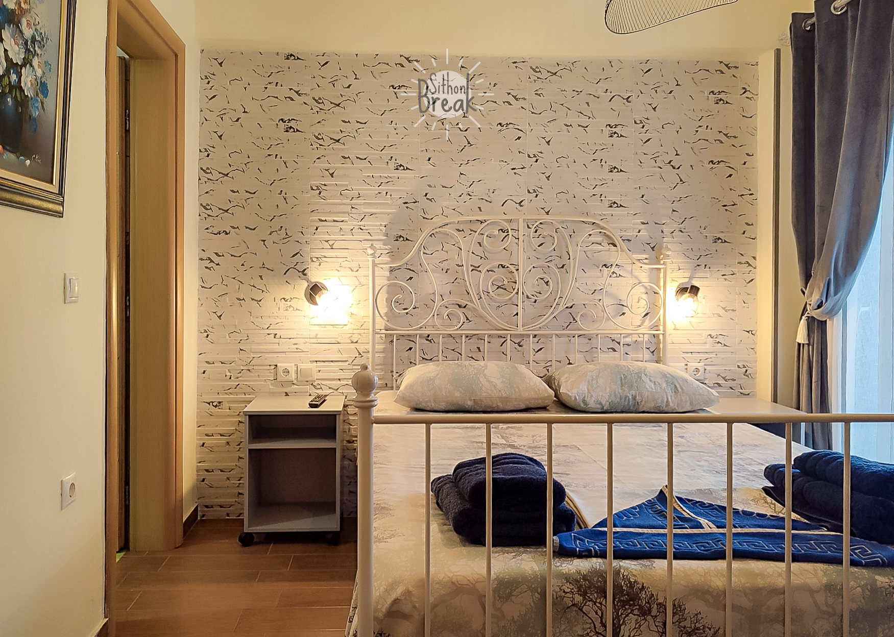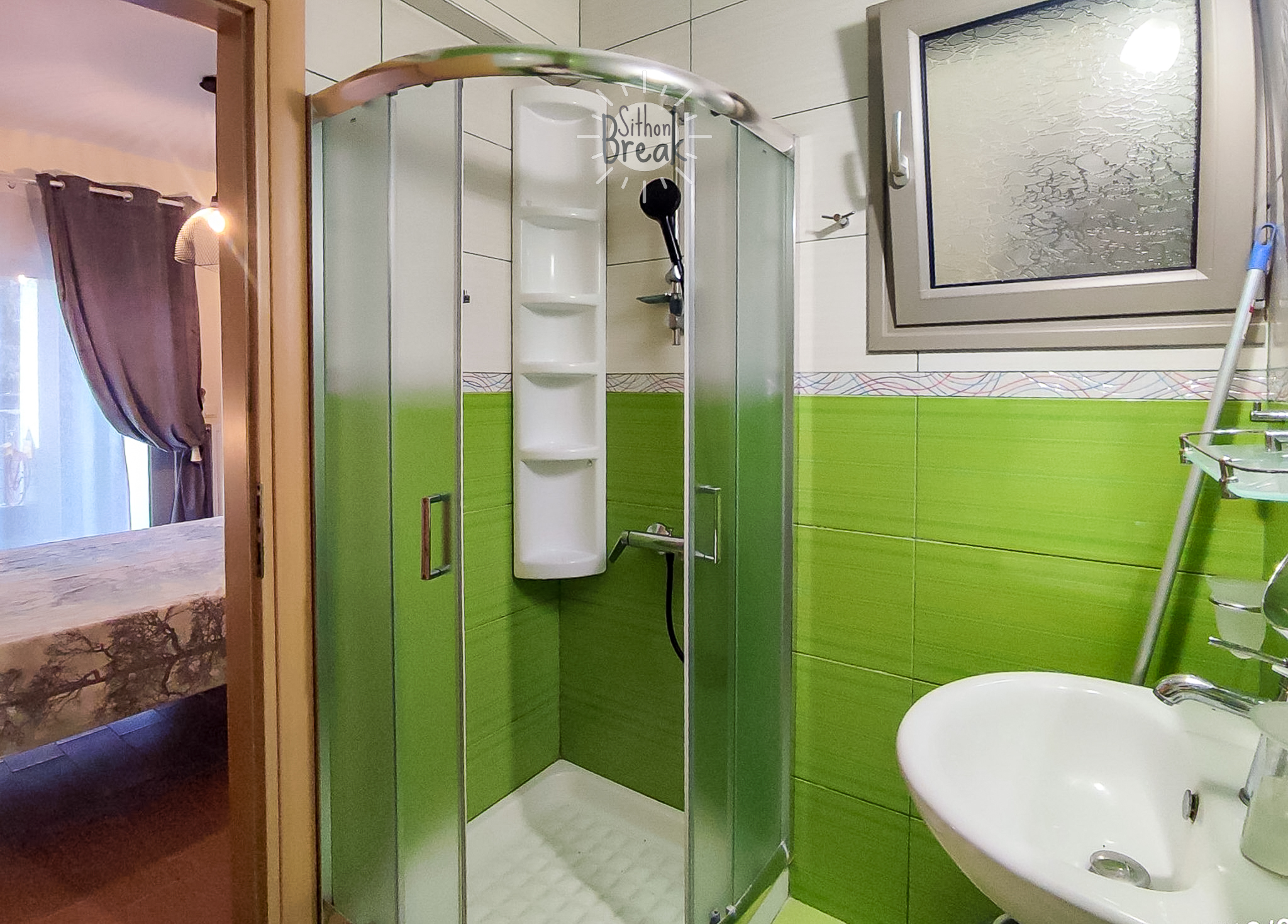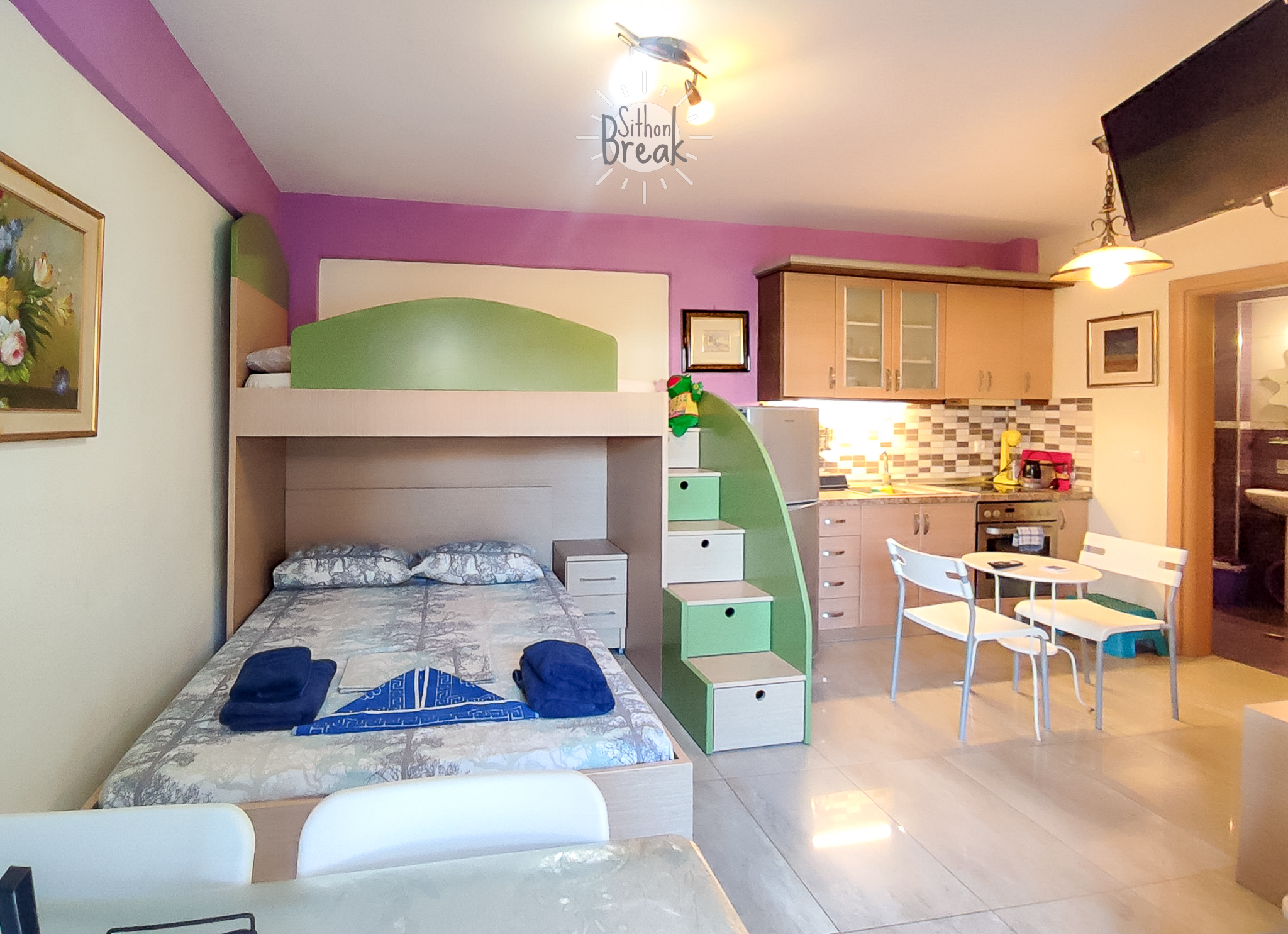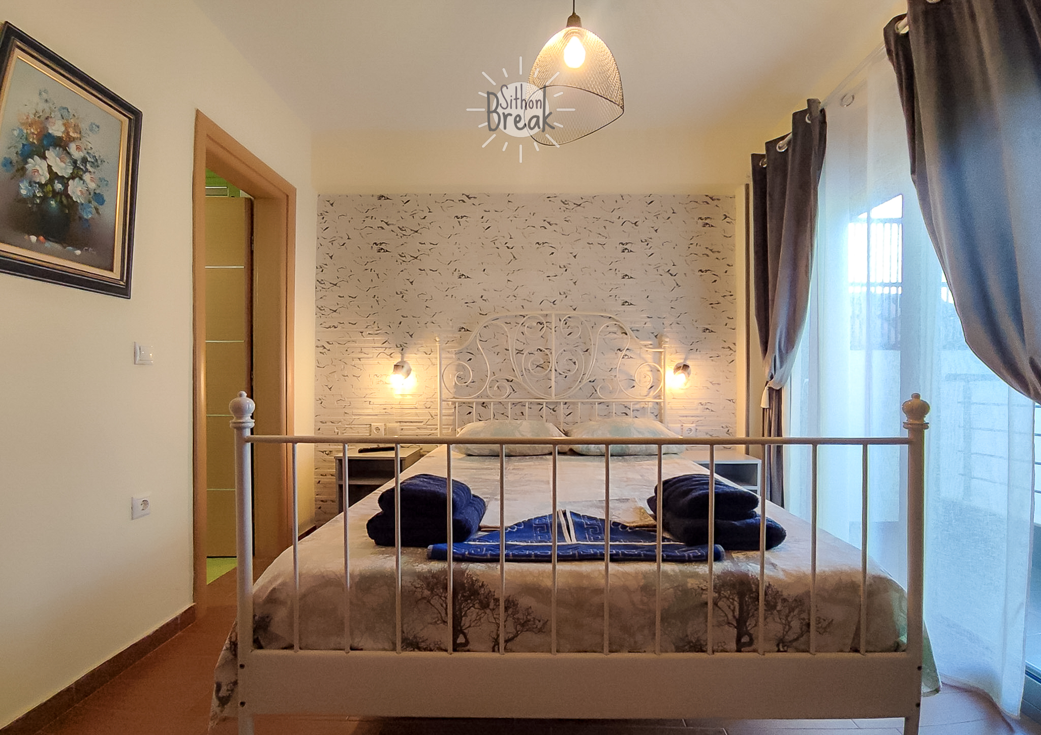 In a serene coastal setting, in one of the most beautiful areas of Sithonia, Halkidiki.  It is a centrally located apartment, within walking distance of a supermarket, tavernas, and beach bars.
