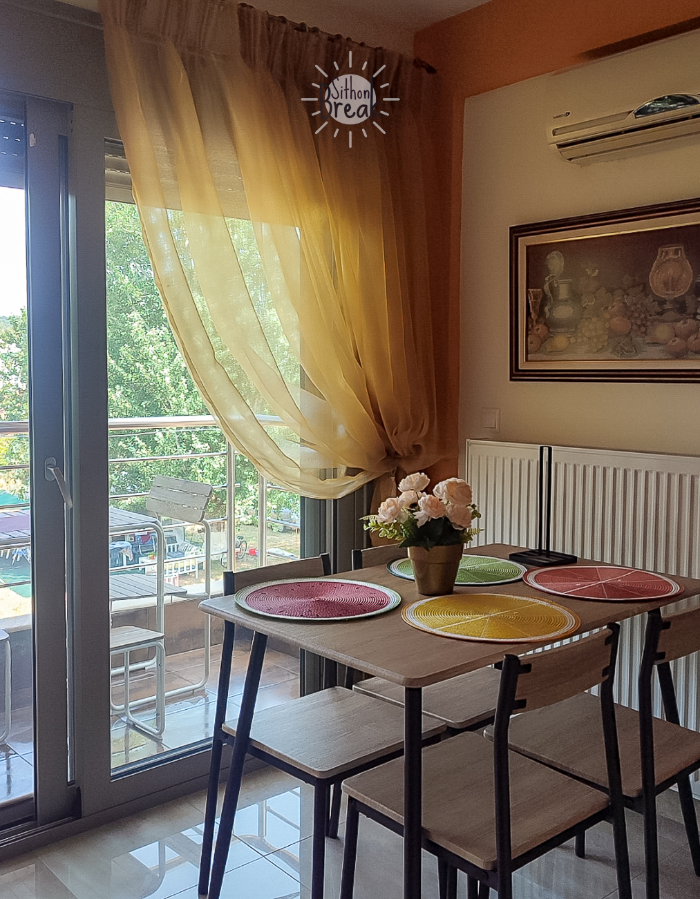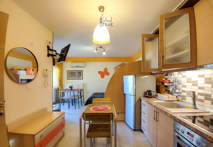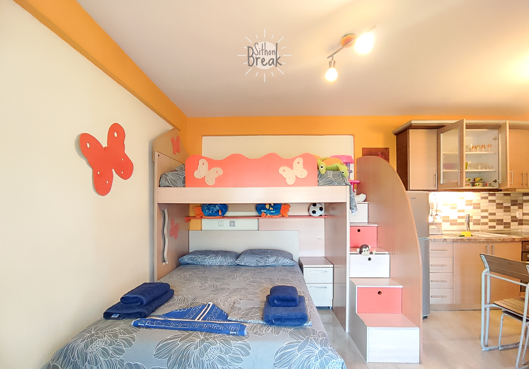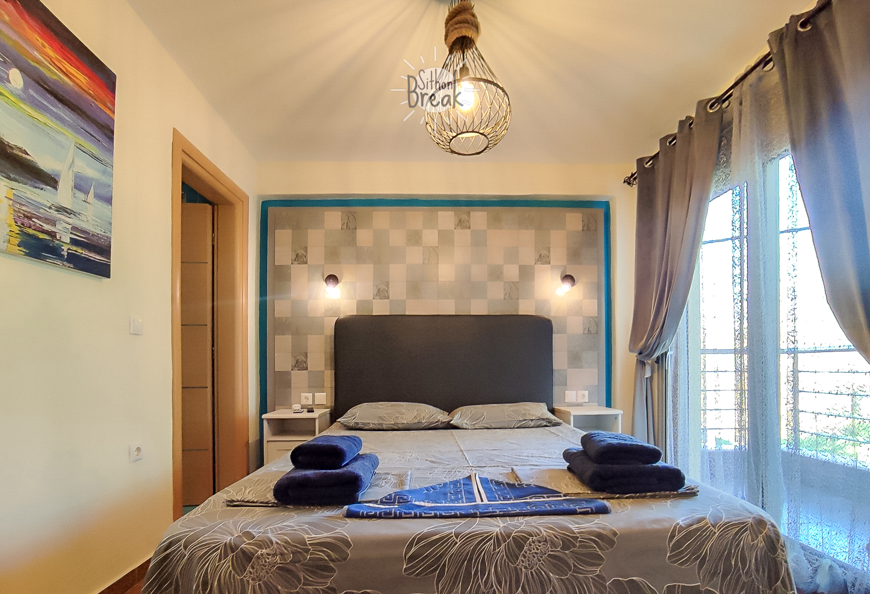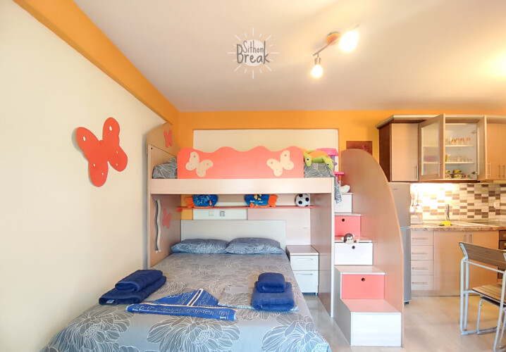 In a serene coastal setting, in one of the most beautiful areas of Sithonia, Halkidiki. It is a centrally located apartment, within walking distance of a supermarket, tavernas, and beach bars.