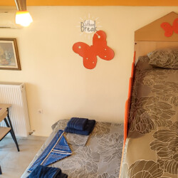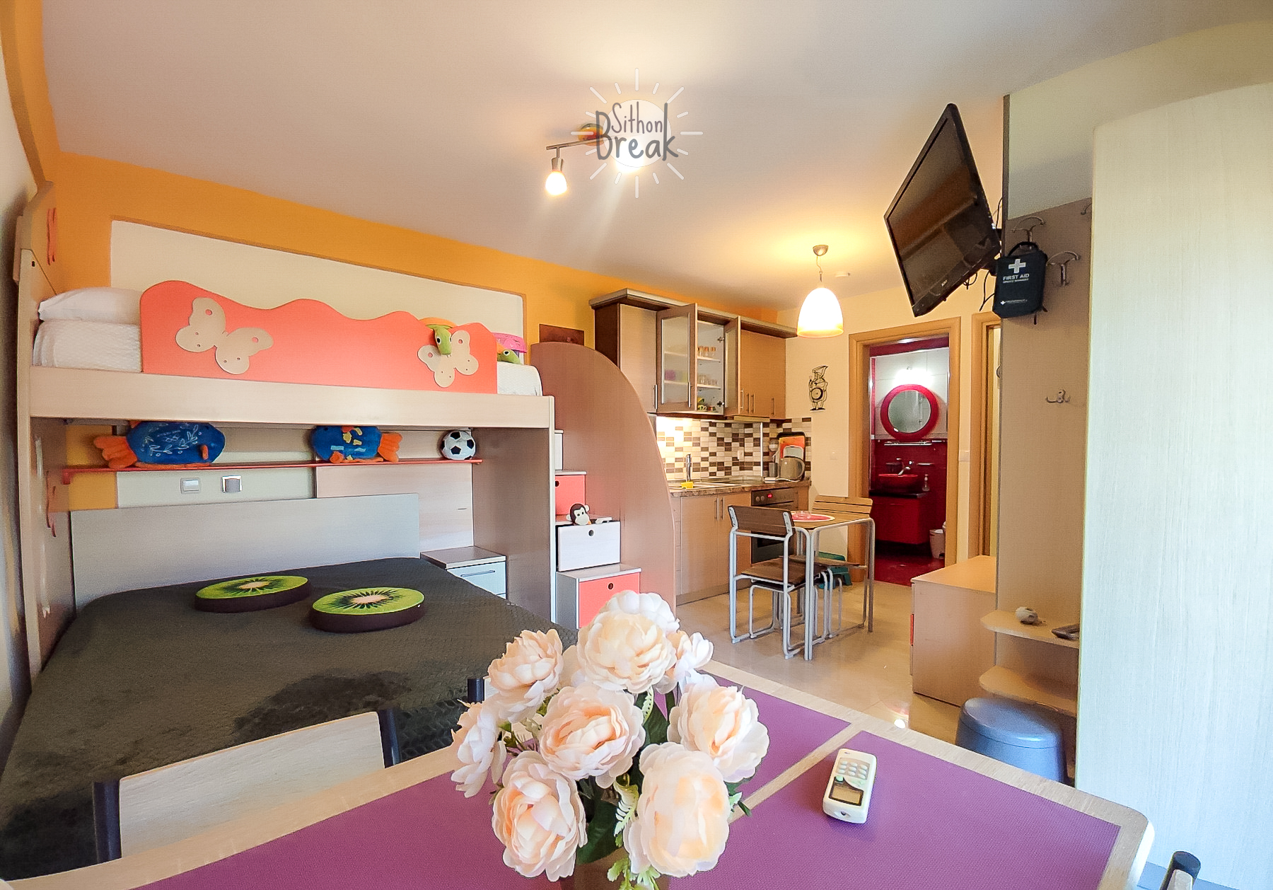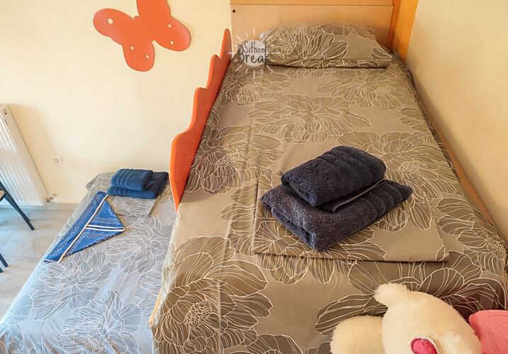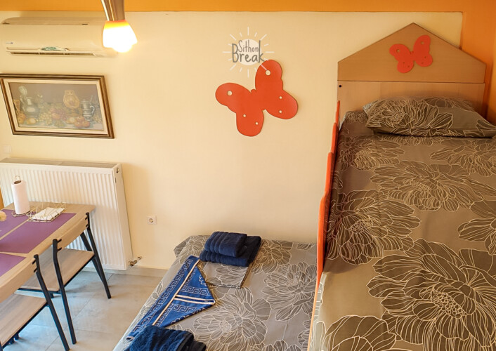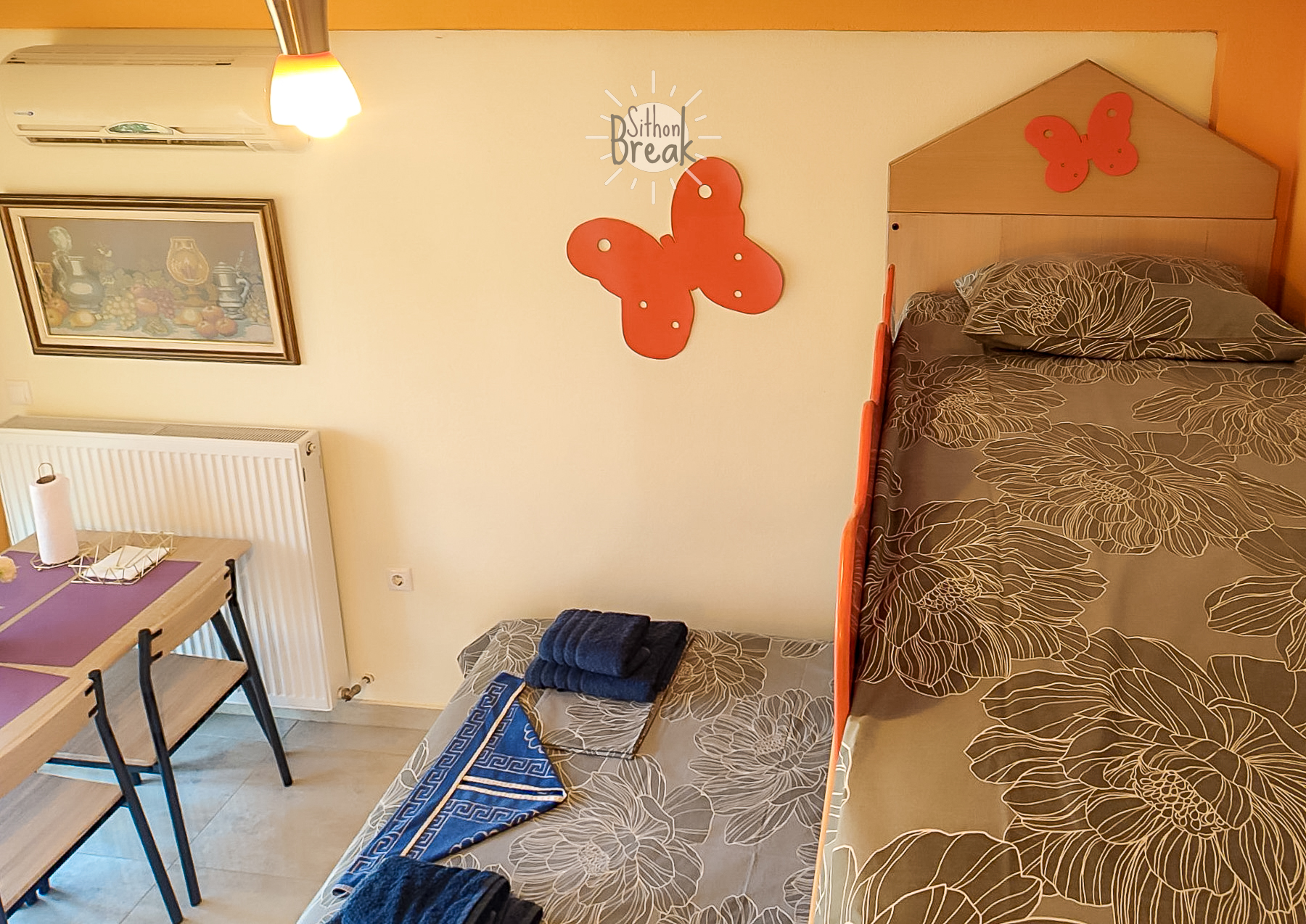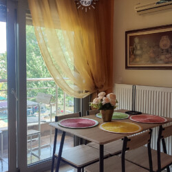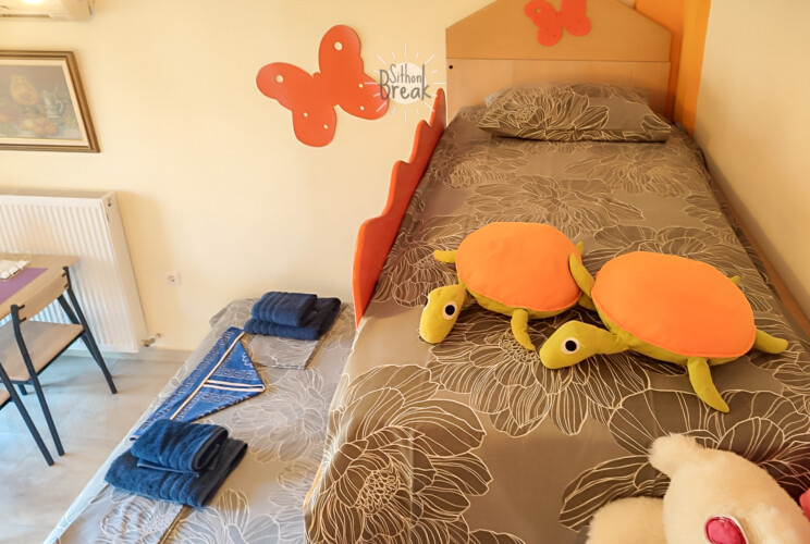 In a serene coastal setting, in one of the most beautiful areas of Sithonia, Halkidiki. It is a centrally located apartment, within walking distance of a supermarket, tavernas, and beach bars.
