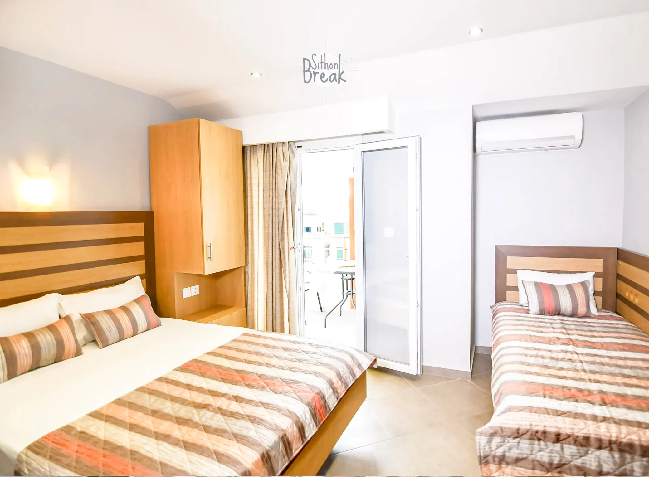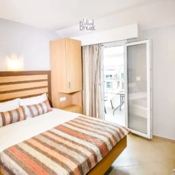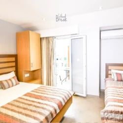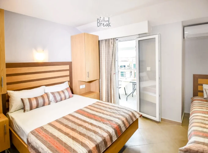 The studio features one King Size bed and one Queen Size bed, providing spacious and luxurious accommodation for up to 3 guests. The bright, tastefully decorated space includes a fully equipped kitchen, private bathroom with shower, air conditioning, Wi-Fi, TV, and a private balcony — perfect for peaceful moments after a day at the beach.